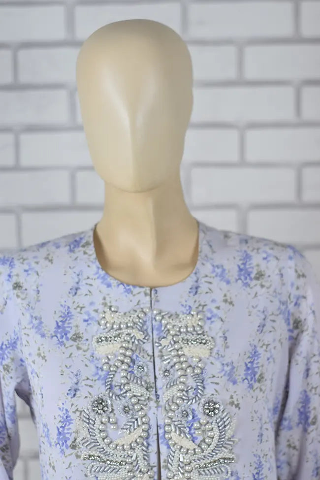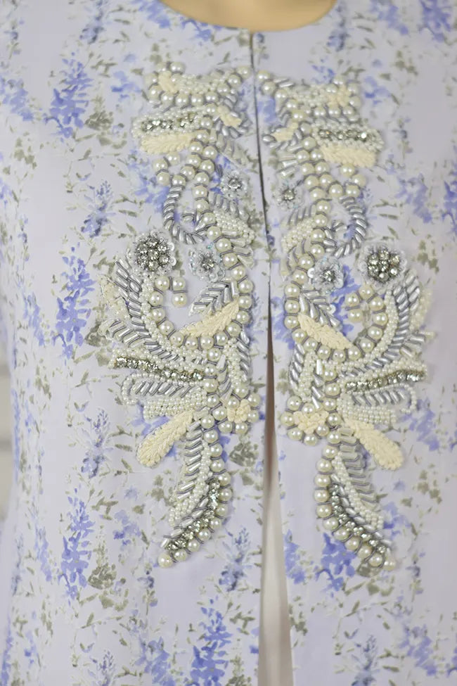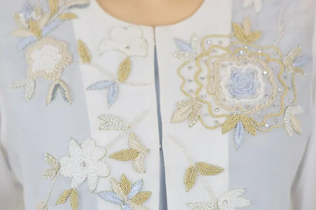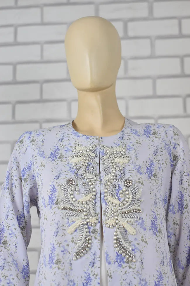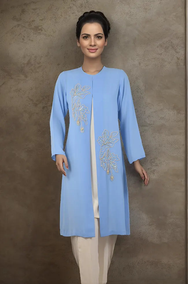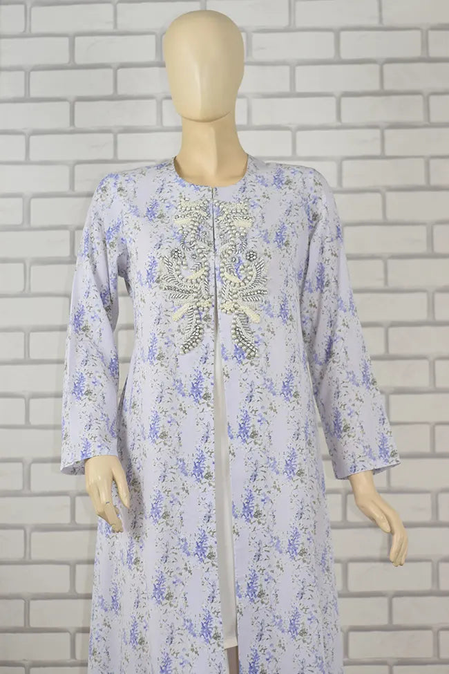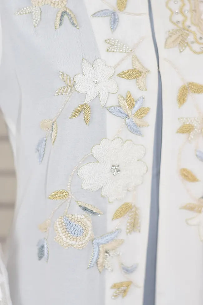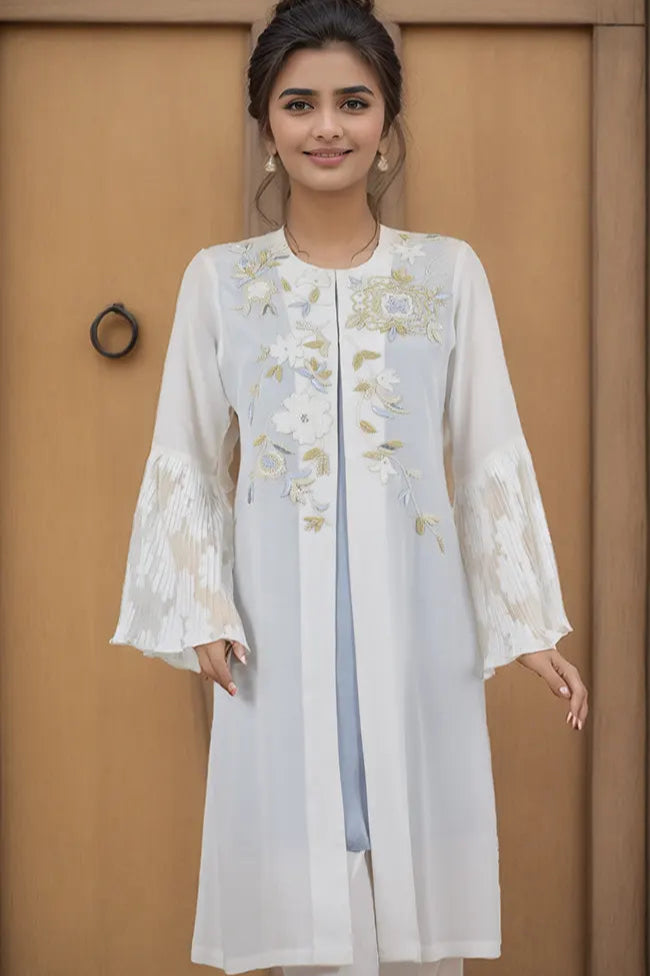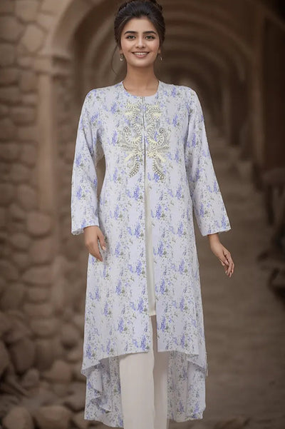 Imagine slipping into the comfortable inner, then layering it with the exquisite open jacket. The luxuriously soft, breathable fabric feels light as air, making it perfect for Karachi's summer evenings. All eyes will be on the delicate floral embroidery on the jacket—a masterful blend of intricate threadwork and glistening kora that catches the light with every move.
