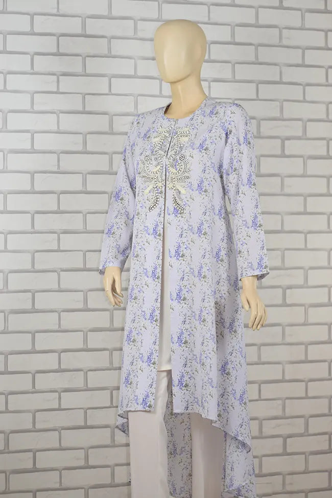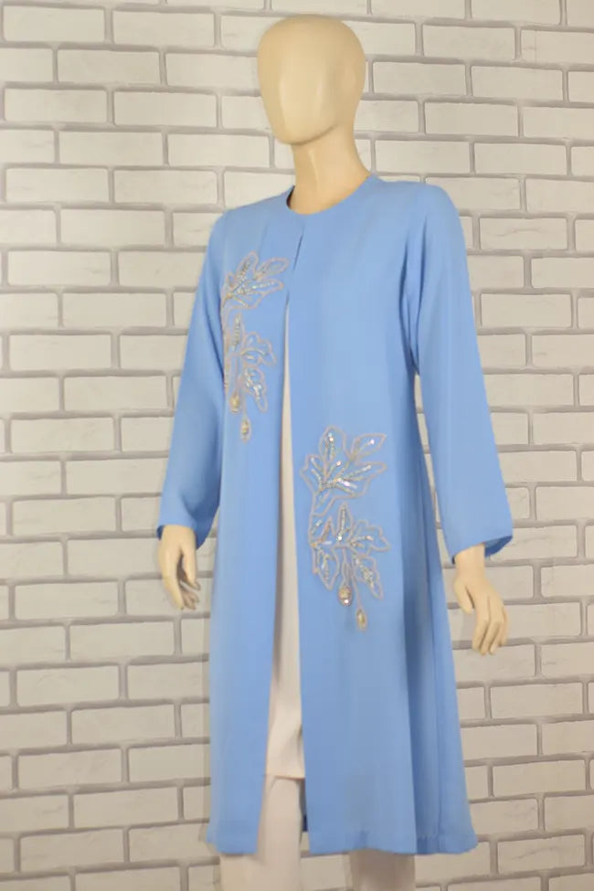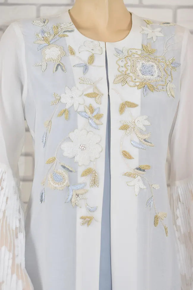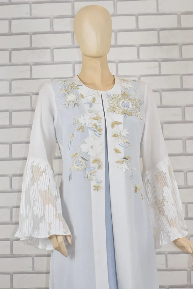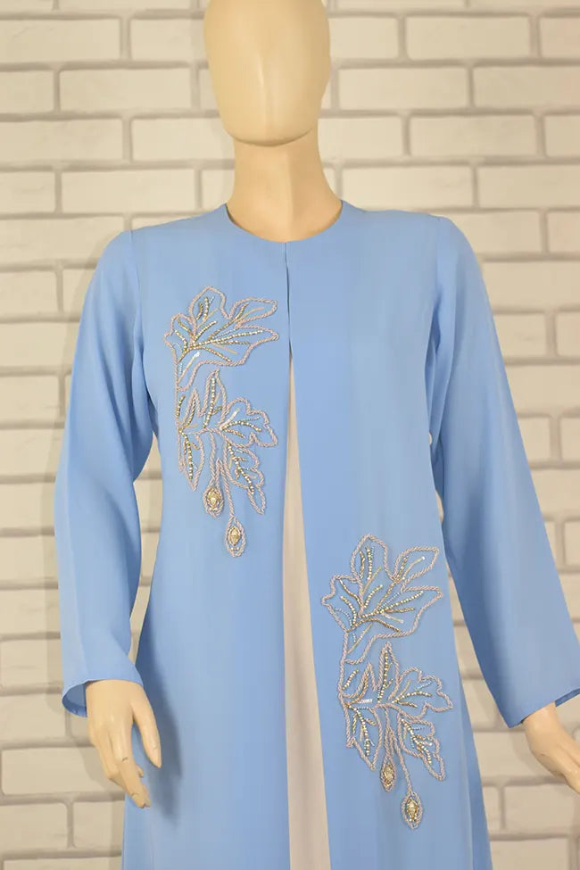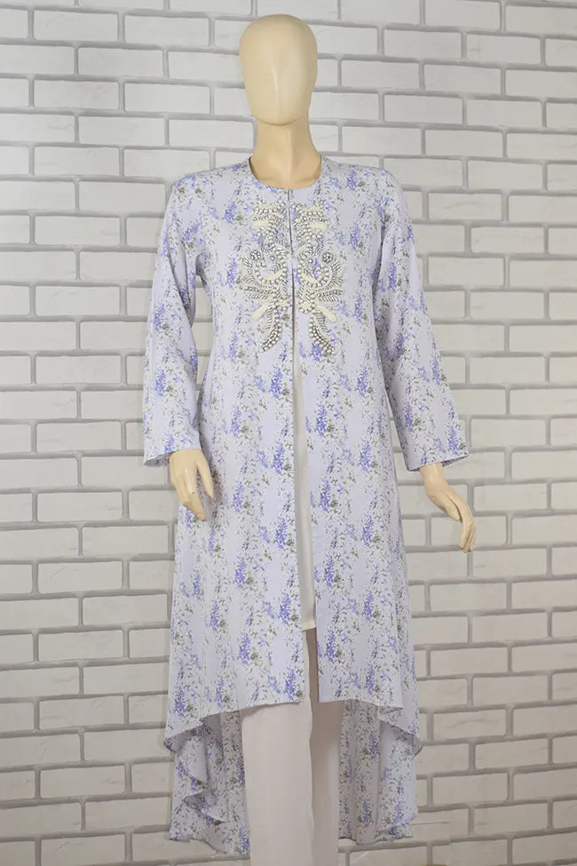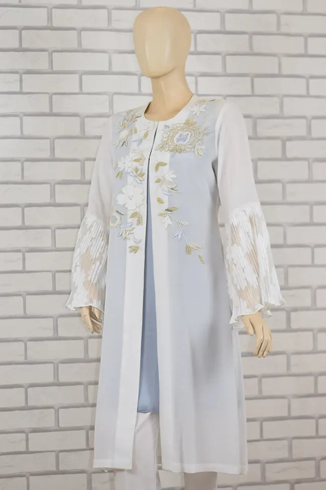 Imagine slipping into the comfortable inner, then layering it with the exquisite open jacket. The luxuriously soft, breathable fabric feels light as air, making it perfect for Karachi's summer evenings. All eyes will be on the delicate floral embroidery on the jacket—a masterful blend of intricate threadwork and glistening kora that catches the light with every move.